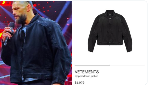Reigns was dressed in a Vetements black denim jacket for his entrance and the segment, and the price tag that came with it raised more than a few eyebrows. According to Complex Style, the jacket is valued at $1,979. “OTC was really in the Vetements on Raw,” they wrote.