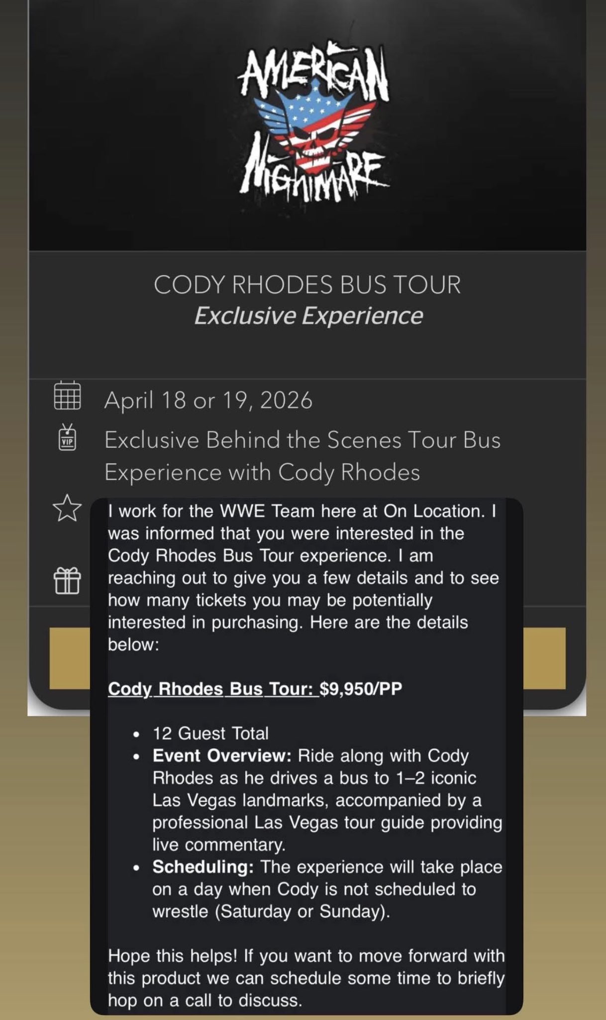 The experience goes well beyond a standard meet-and-greet. According to the listing, fans ride aboard Rhodes’ “Liberty 1” tour bus, making stops at one or two Las Vegas landmarks while getting behind-the-scenes WrestleMania access. “Take an unforgettable tour with ‘The American Nightmare’ Cody Rhodes. This exclusive bus tour will give you a behind-the-scenes look at the electric atmosphere of WrestleMania, complete with personal stories from Cody himself,” the listing reads.